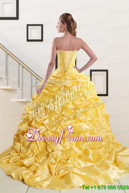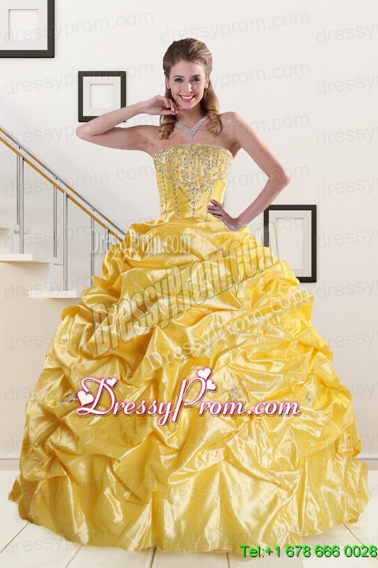 Neckline : StraplessShown Color : YellowSilhouette : Ball GownsSleeve Length : sleevelessHemline : floor lengthBack Detail : Lace upFabric : OrganzaEmbellishment : Beading,Pick UpsOccasion : Military Ball,Sweet 16,QuinceaneraSeason : Spring,Summer,Fall,Winter