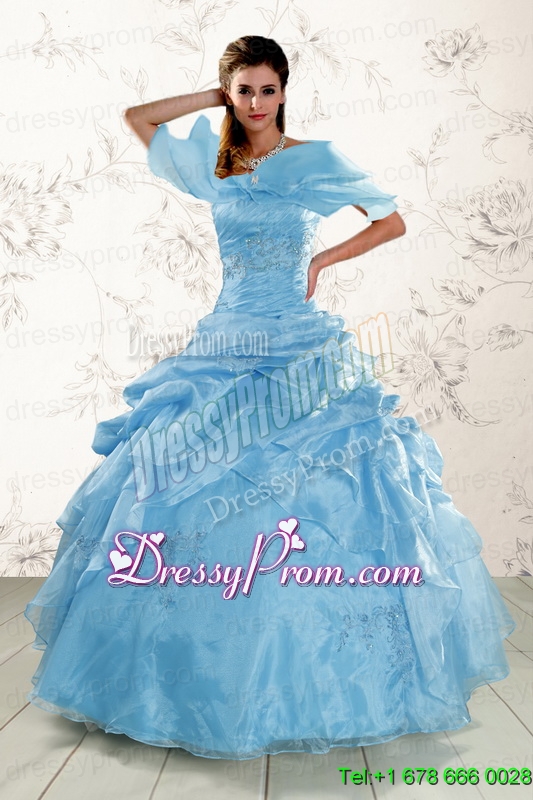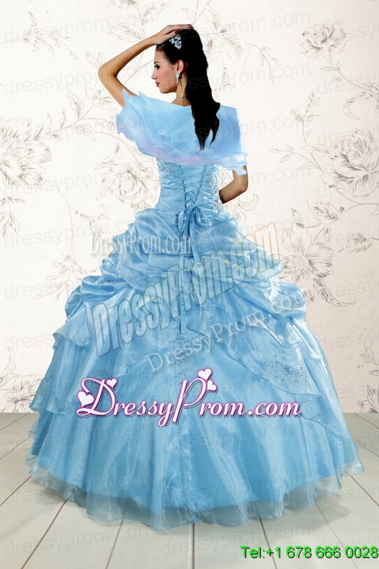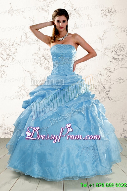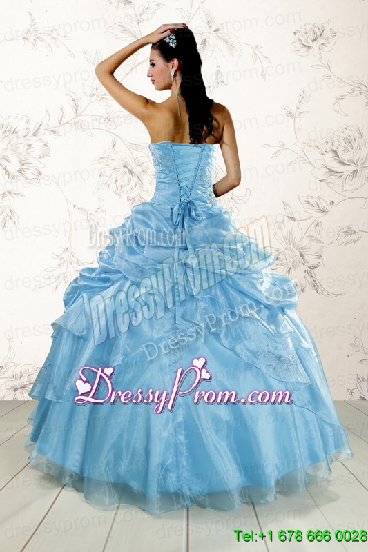 Neckline : StraplessShown Color : Aqua BlueSilhouette : Ball GownsSleeve Length : sleevelessHemline : floor lengthBack Detail : Lace upFabric : OrganzaEmbellishment : Appliques,Pick UpsOccasion : Military Ball,Sweet 16,QuinceaneraSeason : Spring,Summer,Fall,Winter