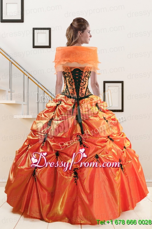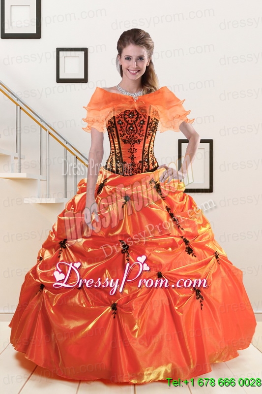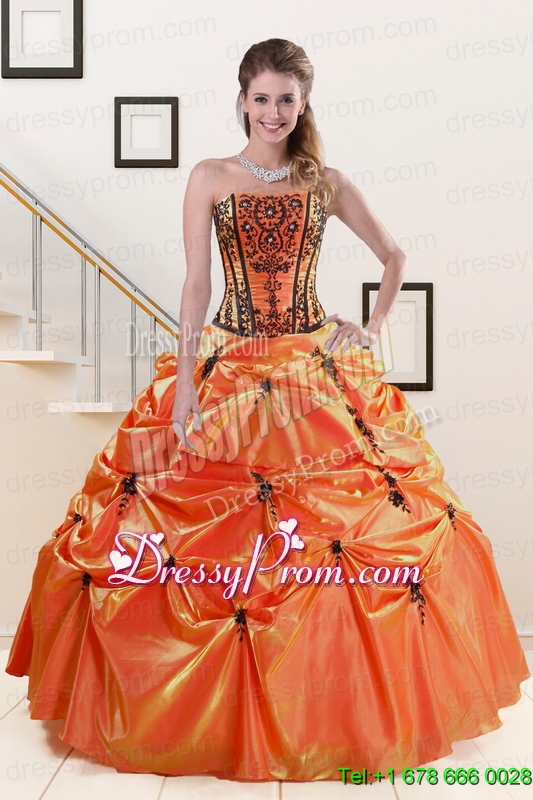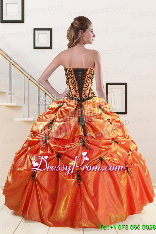 Neckline : SweetheartShown Color : Orange RedSleeve Length : sleevelessHemline : floor lengthBack Detail : Lace upFabric : TaffetaEmbellishment : Appliques,Pick UpsOccasion : Military Ball,Sweet 16,QuinceaneraSeason : Spring,Summer,Fall,Winter