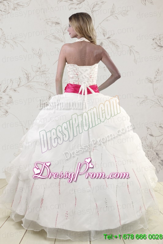 Neckline : Halter topShown Color : WhiteSilhouette : Ball GownsSleeve Length : sleevelessHemline : floor lengthBack Detail : Lace upFabric : OrganzaEmbellishment : Beading,BeltOccasion : Military Ball,Sweet 16,QuinceaneraSeason : Spring,Summer,Fall,Winter