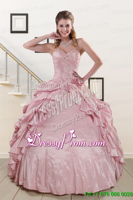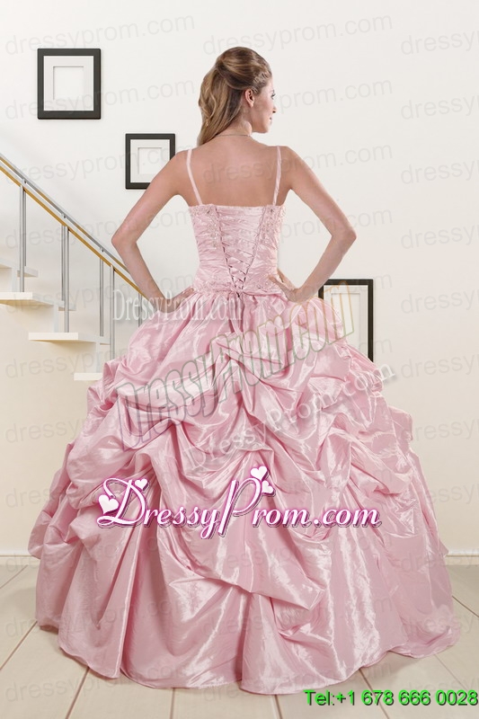Neckline : Spaghetti strapsShown Color : Pink Silhouette : Ball GownsSleeve Length : sleevelessHemline : floor lengthBack Detail : Lace upFabric : TaffetaEmbellishment : Beading,RufflesOccasion : Military Ball,Sweet 16,QuinceaneraSeason : Spring,Summer,Fall,Winter
