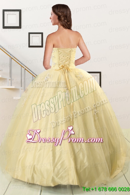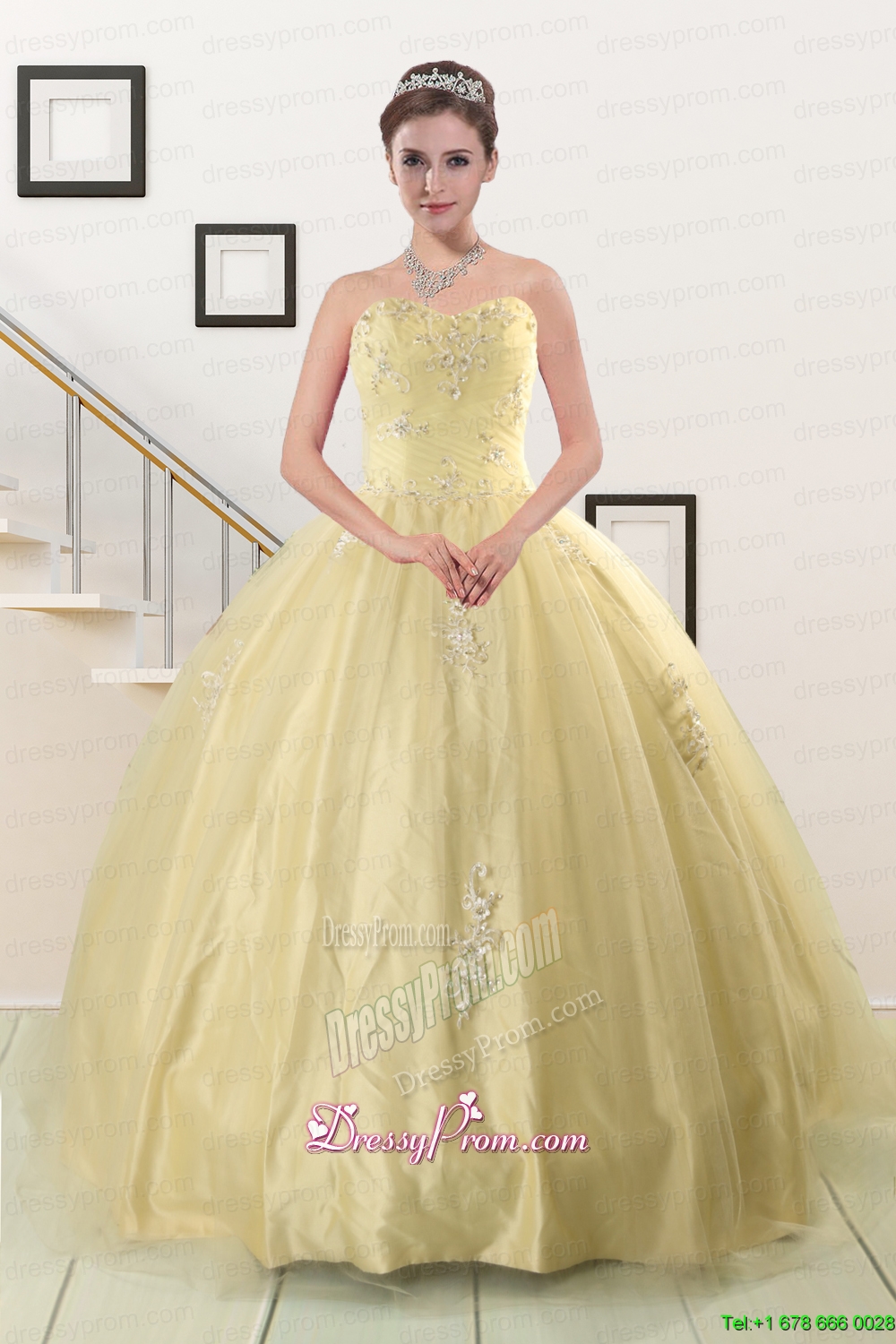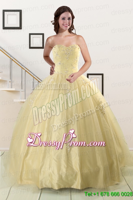 Neckline : SweetheartShown Color : Light YellowSilhouette : Ball GownsSleeve Length : sleevelessHemline : floor lengthBack Detail : Lace upFabric : Taffeta,TulleEmbellishment : AppliquesOccasion : Military Ball,Sweet 16,QuinceaneraSeason : Spring,Summer,Fall,Winter