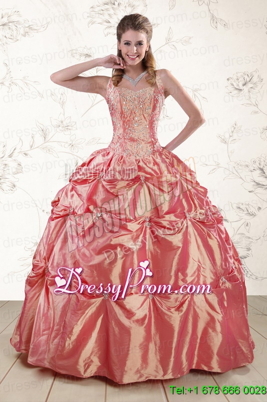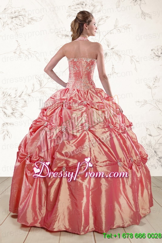 Neckline : Halter topShown Color : Watermelon RedSilhouette : Ball GownsSleeve Length : sleevelessHemline : floor lengthBack Detail : ZipperFabric : TaffetaEmbellishment : Beading,AppliquesOccasion : Military Ball,Sweet 16,QuinceaneraSeason : Spring,Summer,Fall,Winter