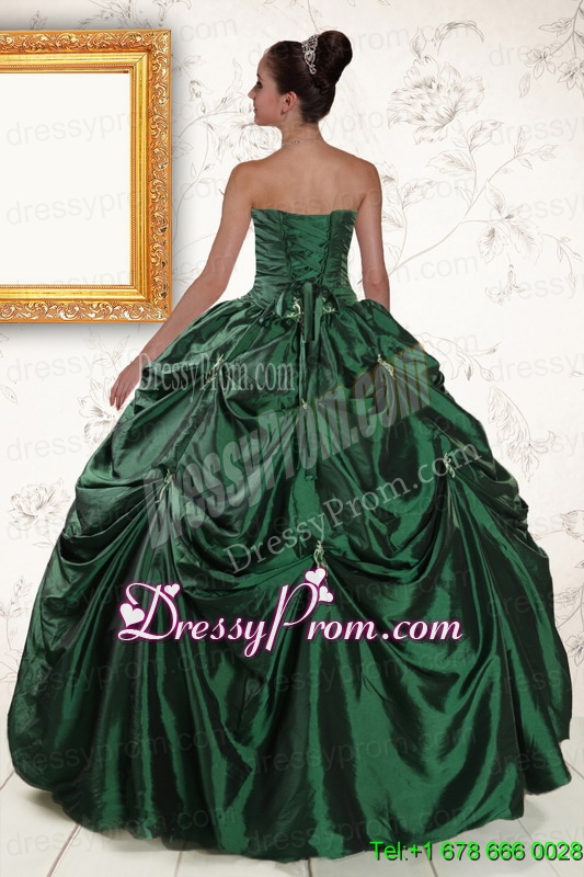 Neckline : StraplessShown Color : Dark GreenSilhouette : Ball GownsSleeve Length : sleevelessHemline : floor lengthBack Detail : Lace upFabric : TaffetaEmbellishment : Appliques,Pick UpsOccasion : Military Ball,Sweet 16,QuinceaneraSeason : Spring,Summer,Fall,Winter