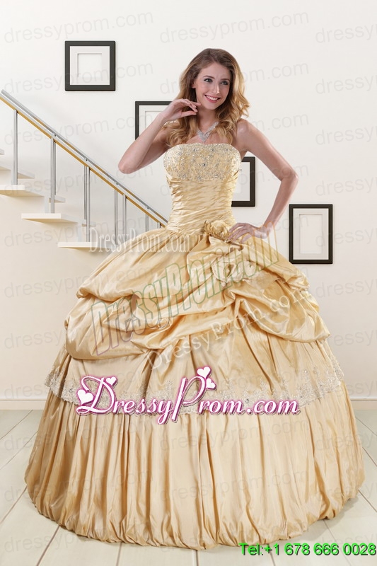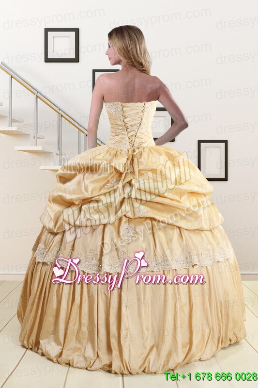 Neckline : StraplessShown Color : ChampagneSilhouette : Ball GownsSleeve Length : sleevelessHemline : floor lengthBack Detail : Lace upFabric : TaffetaEmbellishment : Appliques,Pick UpsOccasion : Military Ball,Sweet 16,QuinceaneraSeason : Spring,Summer,Fall,Winter