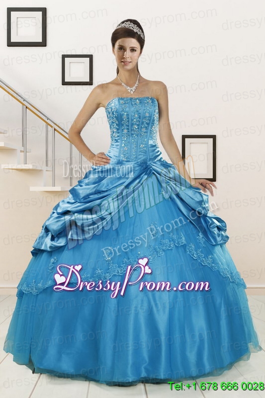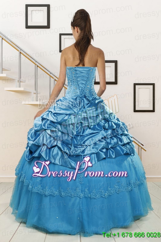 Neckline : StraplessShown Color : Teal Silhouette : Ball GownsSleeve Length : sleevelessHemline : floor lengthBack Detail : Lace upFabric : Taffeta,TulleEmbellishment : Appliques,Pick UpsOccasion : Military Ball,Sweet 16,QuinceaneraSeason : Spring,Summer,Fall,Winter