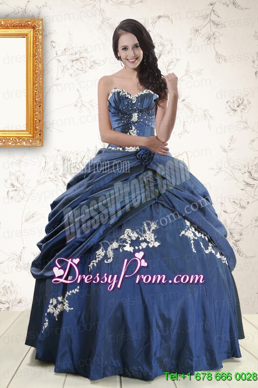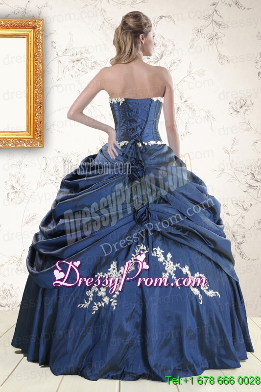 Neckline : SweetheartShown Color : Navy BlueSilhouette : Ball GownsSleeve Length : sleevelessHemline : floor lengthBack Detail : Lace upFabric : TaffetaEmbellishment : Appliques,Pick UpsOccasion : Military Ball,Sweet 16,QuinceaneraSeason : Spring,Summer,Fall,Winter