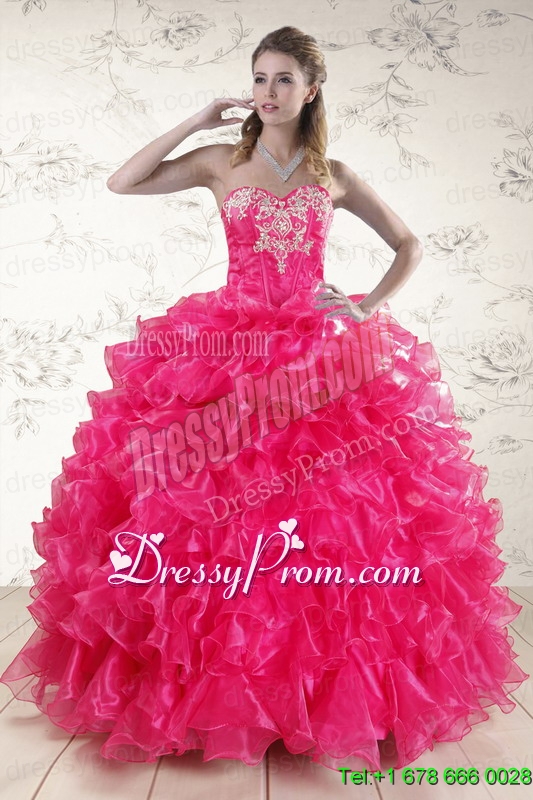 Neckline : SweetheartShown Color : Hot PinkSilhouette : Ball GownsSleeve Length : sleevelessHemline : floor lengthBack Detail : Lace upFabric : OrganzaEmbellishment : Appliques,RufflesOccasion : Military Ball,Sweet 16,QuinceaneraSeason : Spring,Summer,Fall,Winter