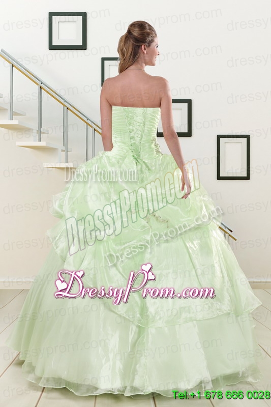 Neckline : StraplessShown Color : Green,YellowSilhouette : Ball GownsSleeve Length : sleevelessHemline : floor lengthBack Detail : Lace upFabric : OrganzaEmbellishment : Beading,RufflesOccasion : Military Ball,Sweet 16,QuinceaneraSeason : Spring,Summer,Fall,Winter