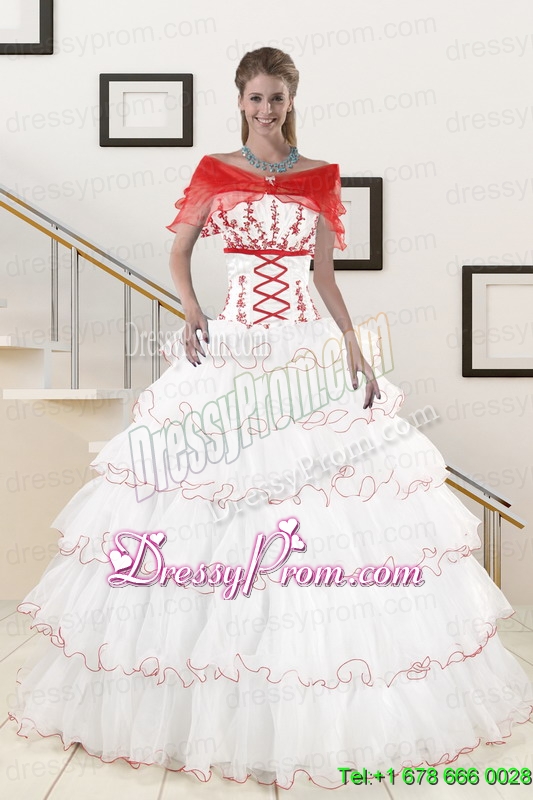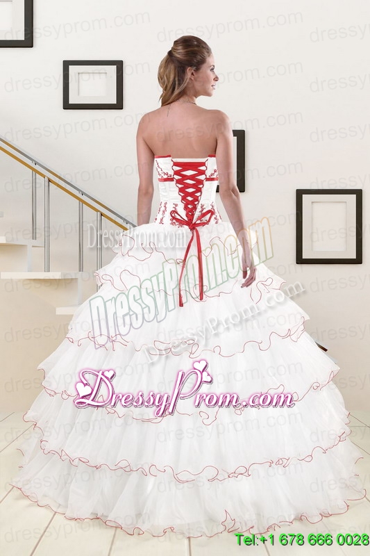 Neckline : StraplessShown Color : White And Red Silhouette : Ball GownsSleeve Length : sleevelessHemline : floor lengthBack Detail : Lace upFabric : OrganzaEmbellishment : Appliques,Ruffled LayersOccasion : Military Ball,Sweet 16,QuinceaneraSeason : Spring,Summer,Fall,Winter