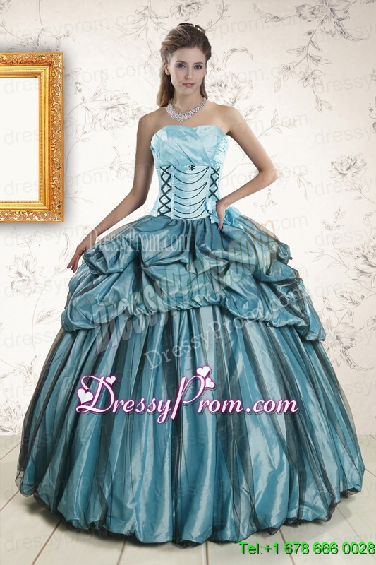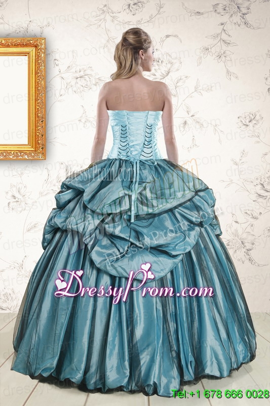 Neckline : StraplessShown Color : Teal Silhouette : Ball GownsSleeve Length : sleevelessHemline : floor lengthBack Detail : Lace upFabric : TaffetaEmbellishment : Pick UpsOccasion : Military Ball,Sweet 16,QuinceaneraSeason : Spring,Summer,Fall,Winter