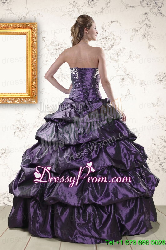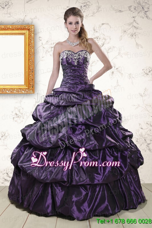 Neckline : SweetheartShown Color : PurpleSilhouette : Ball GownsSleeve Length : sleevelessHemline : floor lengthBack Detail : Lace upFabric : TaffetaEmbellishment : Appliques,Pick UpsOccasion : Military Ball,Sweet 16,QuinceaneraSeason : Spring,Summer,Fall,Winter