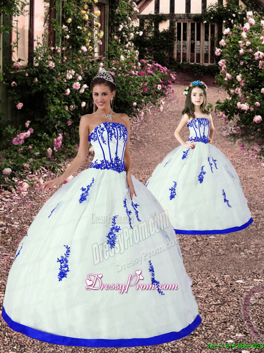 Neckline : StraplessShown Color : White,Royal BlueSilhouette : Ball GownsSleeve Length : sleevelessHemline : floor lengthBack Detail : Lace upFabric : Satin,OrganzaEmbellishment : AppliquesOccasion : Prom,Formal Evening,Graduation,Military Ball,Sweet 16,QuinceaneraSeason : Spring,Summer,Fall,Winter