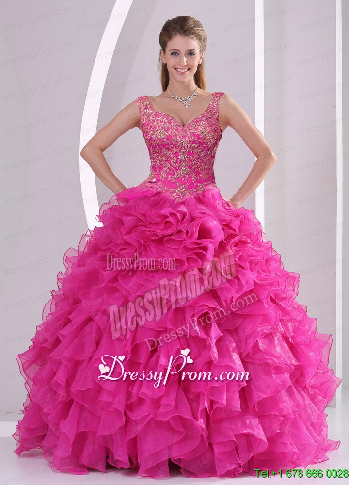Neckline : V-neckShown Color : Hot PinkSilhouette : Ball GownsSleeve Length : sleevelessHemline : floor lengthBack Detail : Lace upFabric : OrganzaEmbellishment : Appliques,RufflesOccasion : Military Ball,Sweet 16,QuinceaneraSeason : Spring,Summer,Fall,Winter
