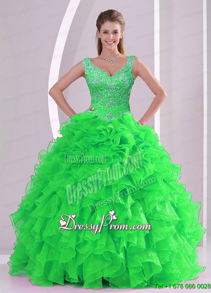 Neckline : V-neckShown Color : Spring GreenSilhouette : Ball GownsSleeve Length : sleevelessHemline : floor lengthBack Detail : Lace upFabric : OrganzaEmbellishment : Appliques,RufflesOccasion : Military Ball,Sweet 16,QuinceaneraSeason : Spring,Summer,Fall,Winter