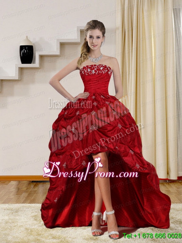 Neckline : StraplessShown Color : RedSilhouette : Ball GownsSleeve Length : sleevelessHemline : high lowBack Detail : Lace upFabric : TaffetaEmbellishment : Embroidery,Pick UpsOccasion : Prom,Party,Cocktail,Homecoming,GraduationSeason : Spring,Summer,Fall