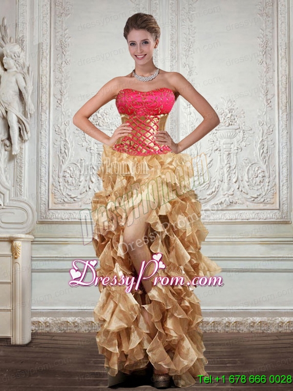 Neckline : StraplessShown Color : ChampagneSilhouette : ShortSleeve Length : sleevelessHemline : high lowBack Detail : Lace upFabric : OrganzaEmbellishment : Beading,EmbroideryOccasion : Prom,Party,Cocktail,Homecoming,GraduationSeason : Spring,Summer,Fall