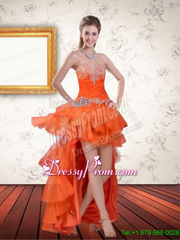 Neckline : SweetheartShown Color : OrangeSilhouette : ShortSleeve Length : sleevelessHemline : high lowBack Detail : Lace upFabric : OrganzaEmbellishment : Beading,RufflesOccasion : Prom,Party,Cocktail,Homecoming,GraduationSeason : Spring,Summer,Fall