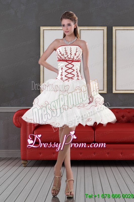 Neckline : Strapless Shown Color : White And Red Silhouette : Short Sleeve Length : sleeveless Hemline : mini length Back Detail : Lace up Fabric : Organza Embellishment : Embroidery,Ruffled Layers Occasion : Prom,Party,Cocktail,Homecoming,Graduation Season : Spring,Summer,Fall
