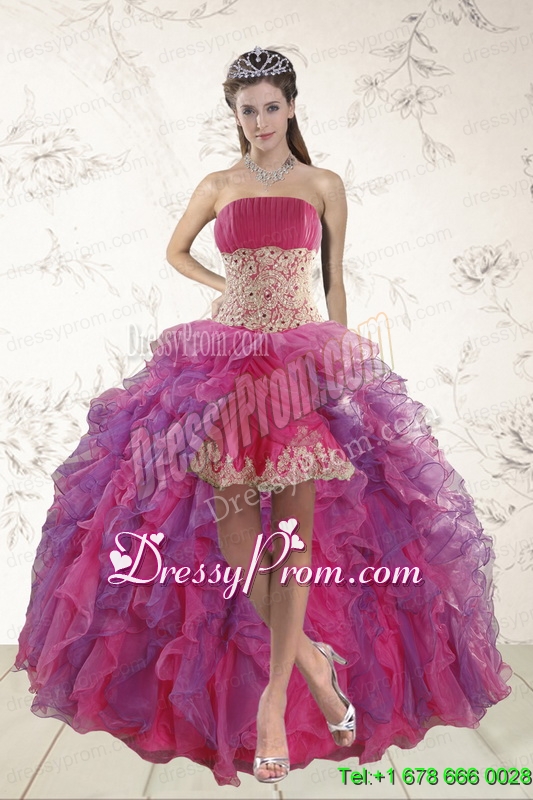 Neckline : StraplessShown Color : Multi-colorSilhouette : ShortSleeve Length : sleevelessHemline : high lowBack Detail : Lace upFabric : OrganzaEmbellishment : Appliques,RufflesOccasion : Prom,Party,Cocktail,Homecoming,GraduationSeason : Spring,Summer,Fall
