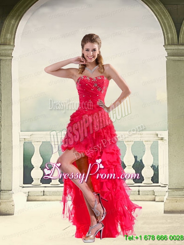 Neckline : StraplessShown Color : Coral RedSilhouette : Ball GownsSleeve Length : sleevelessHemline : high lowBack Detail : Lace upFabric : OrganzaEmbellishment : Beading,RufflesOccasion : Prom,Party,Cocktail,Homecoming,GraduationSeason : Spring,Summer
