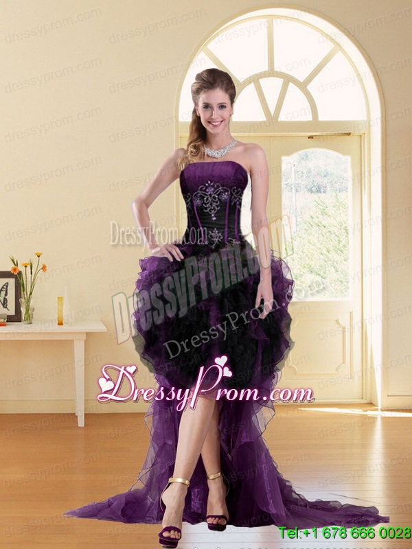 Neckline : StraplessShown Color : Multi-colorSilhouette : ShortSleeve Length : sleevelessHemline : high lowBack Detail : Lace upFabric : OrganzaEmbellishment : Beading,RufflesOccasion : Prom,Party,Cocktail,Homecoming,GraduationSeason : Spring,Summer,Fall