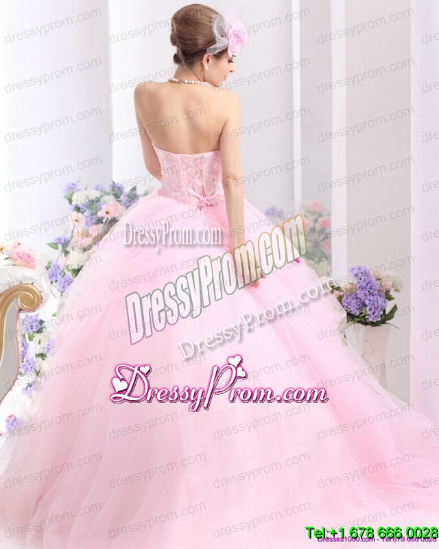 Neckline : StraplessShown Color : Baby PinkSilhouette : A-lineSleeve Length : sleevelessHemline : floor lengthBack Detail : Lace upFabric : TulleEmbellishment : Beading,Hand Made FlowerOccasion : Military Ball,Sweet 16,QuinceaneraSeason : Spring,Summer,Fall,Winter