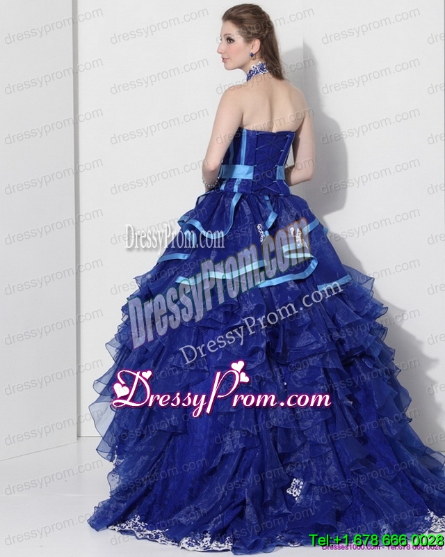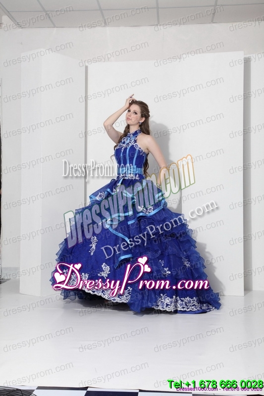 Neckline : Halter top Shown Color : Royal Blue Silhouette : Ball Gowns Sleeve Length : sleeveless Hemline : with train Back Detail : Lace up Fabric : Organza Embellishment : Appliques,Ruffles Occasion : Military Ball,Sweet 16,Quinceanera Season : Spring,Summer,Fall,Winter