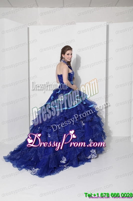 Pretty Halter Top Appliques Blue 2015 Quinceanera Dresses with Ruffles and Brush Train