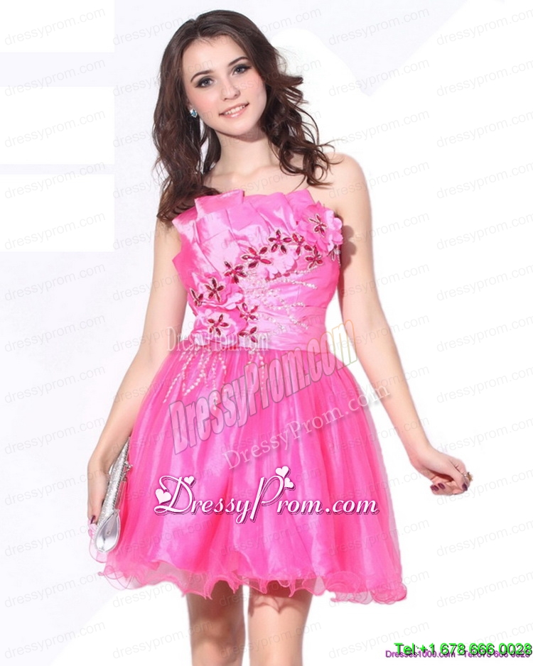 Neckline : StraplessShown Color : Hot PinkSilhouette : A-lineSleeve Length : sleevelessHemline : mini lengthBack Detail : ZipperFabric : OrganzaEmbellishment : Beading,RuchingOccasion : Prom,Party,Cocktail,Homecoming,GraduationSeason : Spring,Summer,Fall,Winter