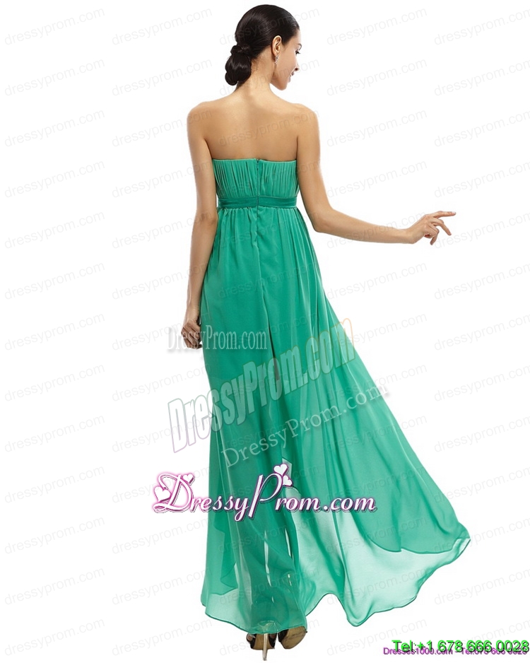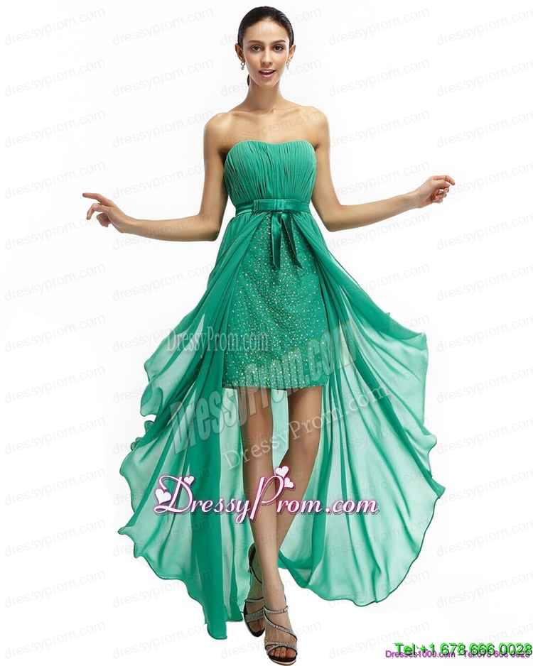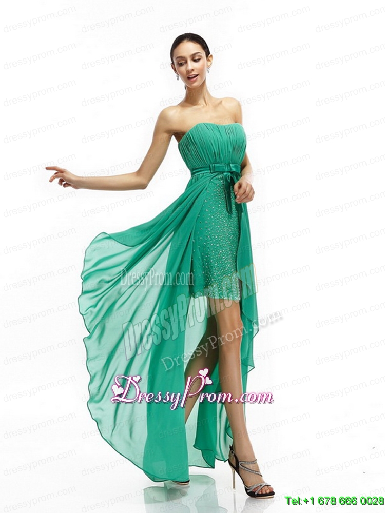 Neckline : StraplessShown Color : TurquoiseSilhouette : Column/SheathSleeve Length : sleevelessHemline : high lowBack Detail : ZipperFabric : ChiffonEmbellishment : Beading,Ruching,BowknotOccasion : Prom,Cocktail,Homecoming,GraduationSeason : Spring,Summer,Fall
