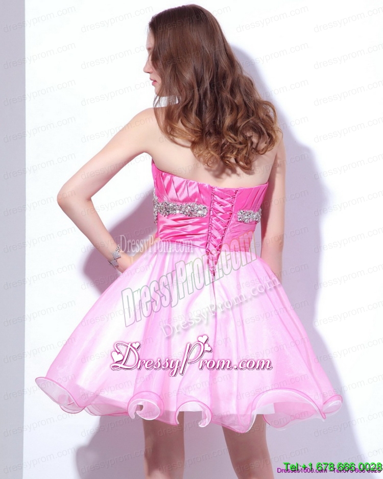 Neckline : StraplessShown Color : Rose Pink Silhouette : Ball GownsSleeve Length : sleevelessHemline : mini lengthBack Detail : Lace upFabric : OrganzaEmbellishment : Beading,RuchingOccasion : Prom,Party,Cocktail,Homecoming,GraduationSeason : Spring,Summer,Fall