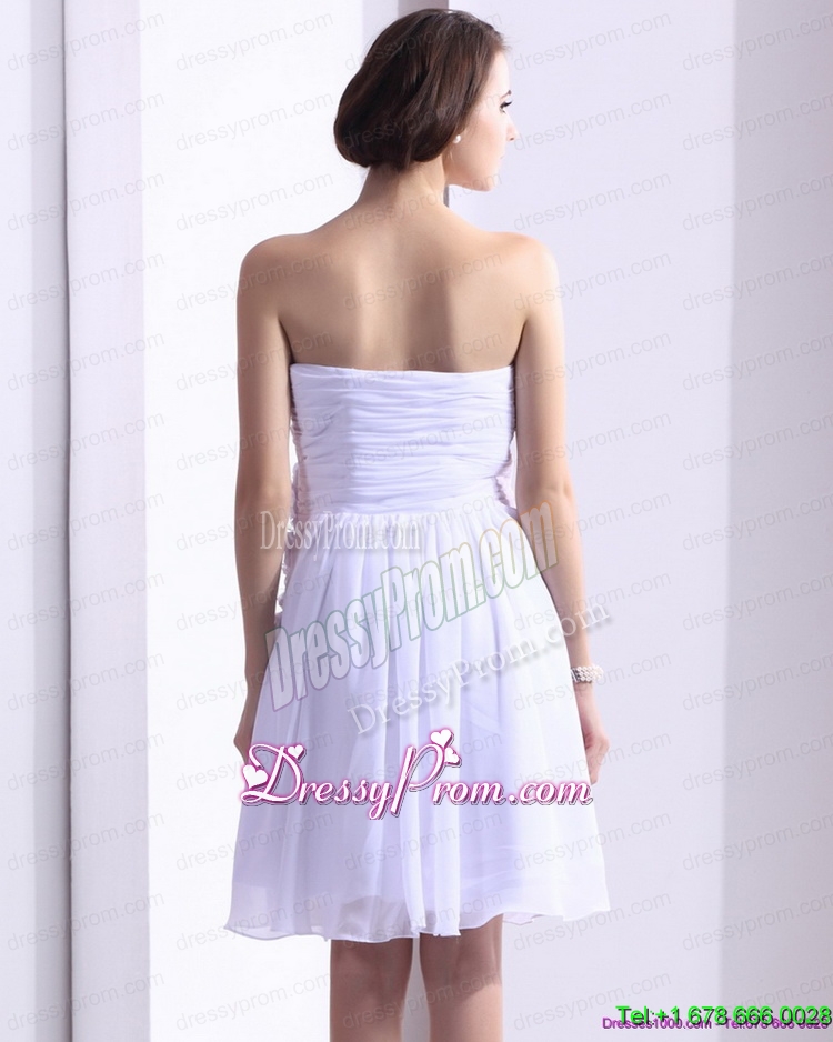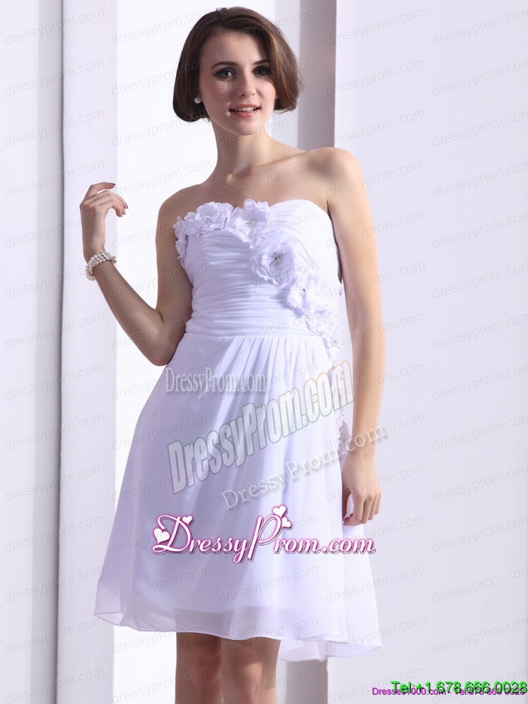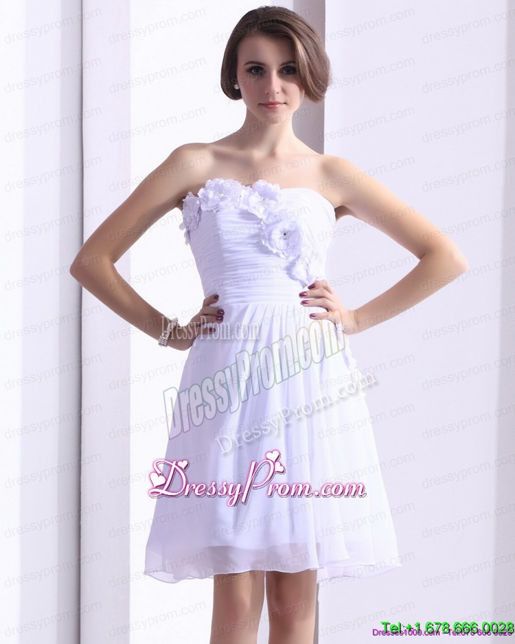 Neckline : StraplessShown Color : WhiteSilhouette : Column/SheathSleeve Length : sleevelessHemline : knee lengthBack Detail : Side zipperFabric : ChiffonEmbellishment : Ruching,Hand Made FlowerOccasion : Prom,Cocktail,Homecoming,GraduationSeason : Spring,Summer,Fall