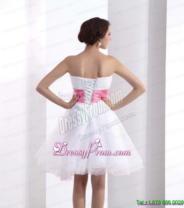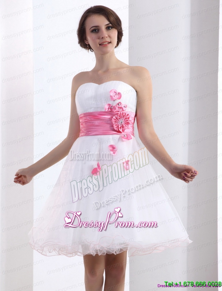 Neckline : Sweetheart Shown Color : White Silhouette : A-line Sleeve Length : sleeveless Hemline : mini length Back Detail : Lace up Fabric : Organza Embellishment : Hand Made Flower Occasion : Prom,Cocktail,Homecoming,Graduation Season : Spring,Summer,Fall