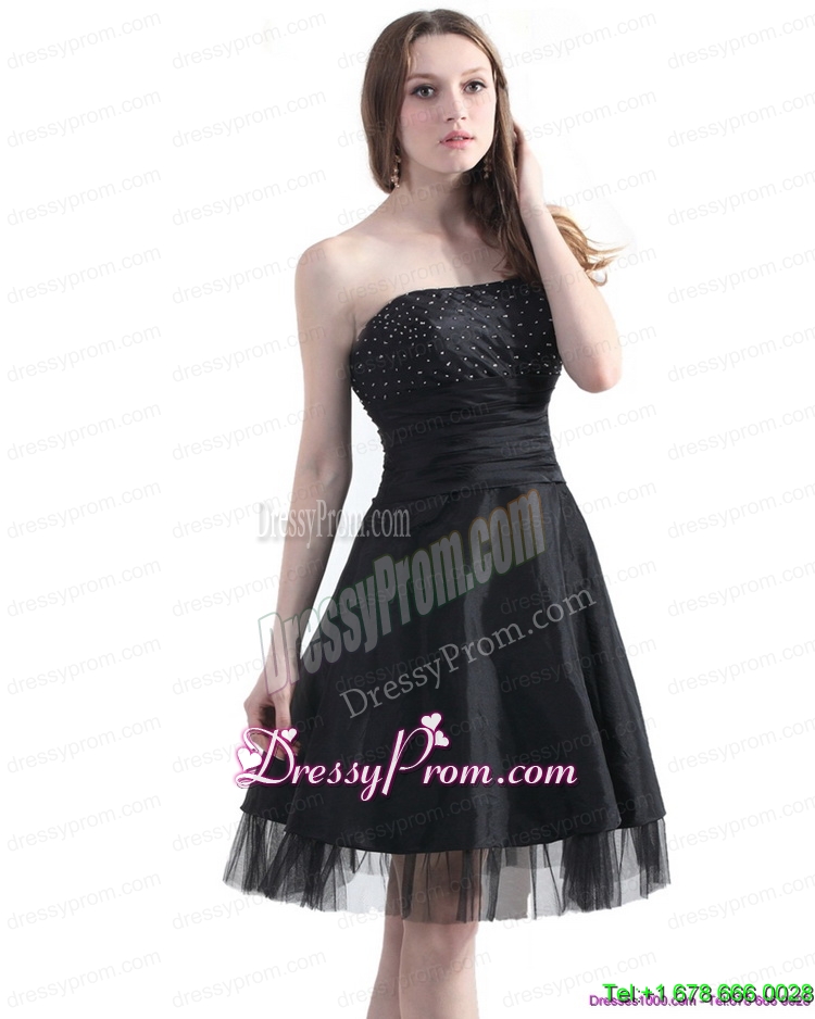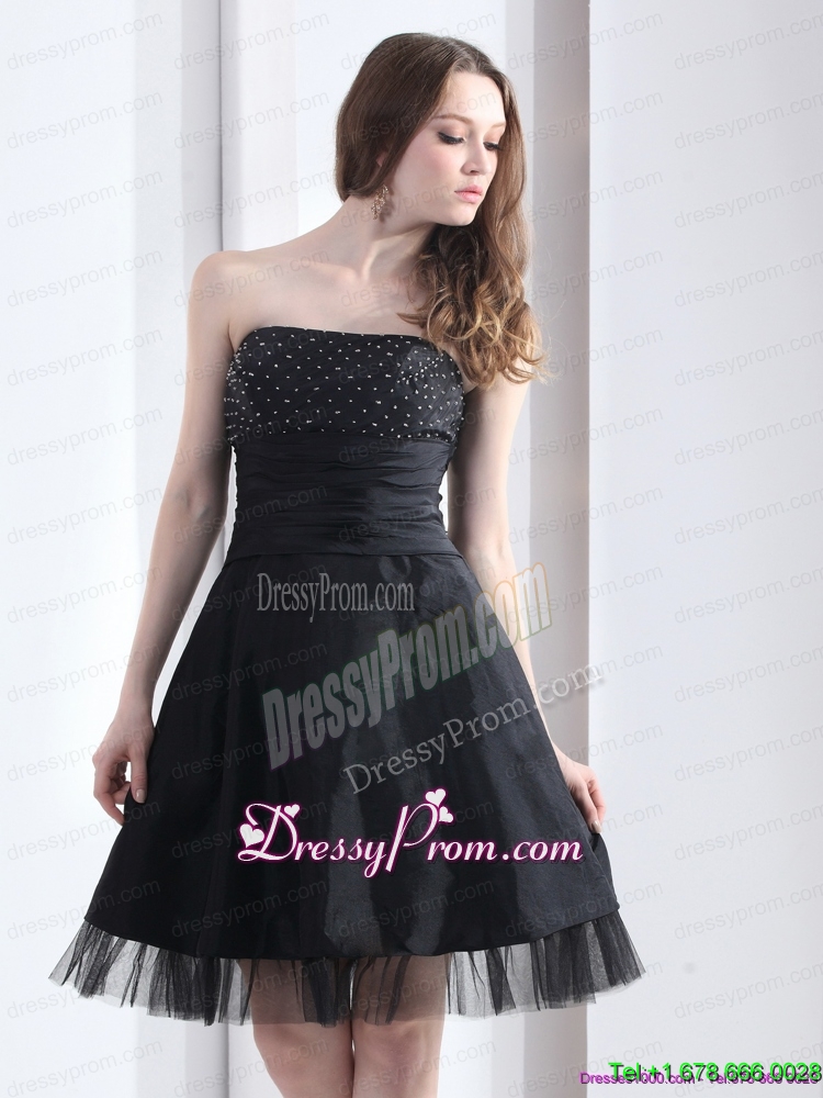 Neckline : StraplessShown Color : BlackSilhouette : A-lineSleeve Length : sleevelessHemline : mini lengthBack Detail : ZipperFabric : TulleEmbellishment : Beading,RuchingOccasion : Prom,Party,Cocktail,Homecoming,GraduationSeason : Spring,Summer,Fall