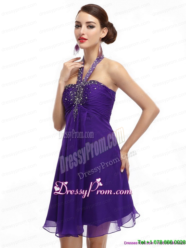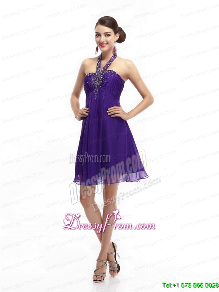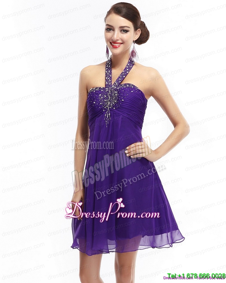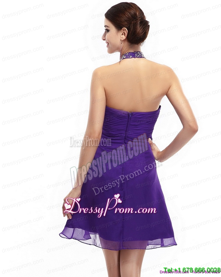 Neckline : Halter topShown Color : PurpleSleeve Length : sleevelessHemline : mini lengthBack Detail : ZipperFabric : ChiffonEmbellishment : Beading,RuchingOccasion : Prom,Cocktail,Homecoming,GraduationSeason : Spring,Summer,Fall