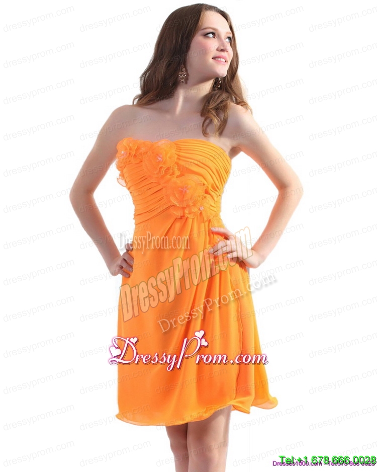 Neckline : StraplessShown Color : OrangeSilhouette : Column/SheathSleeve Length : sleevelessHemline : mini lengthBack Detail : ZipperFabric : ChiffonEmbellishment : Ruching,Hand Made FlowerOccasion : Prom,Party,Cocktail,Homecoming,GraduationSeason : Spring,Summer,Fall