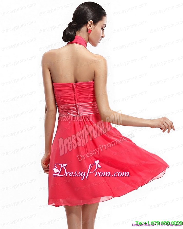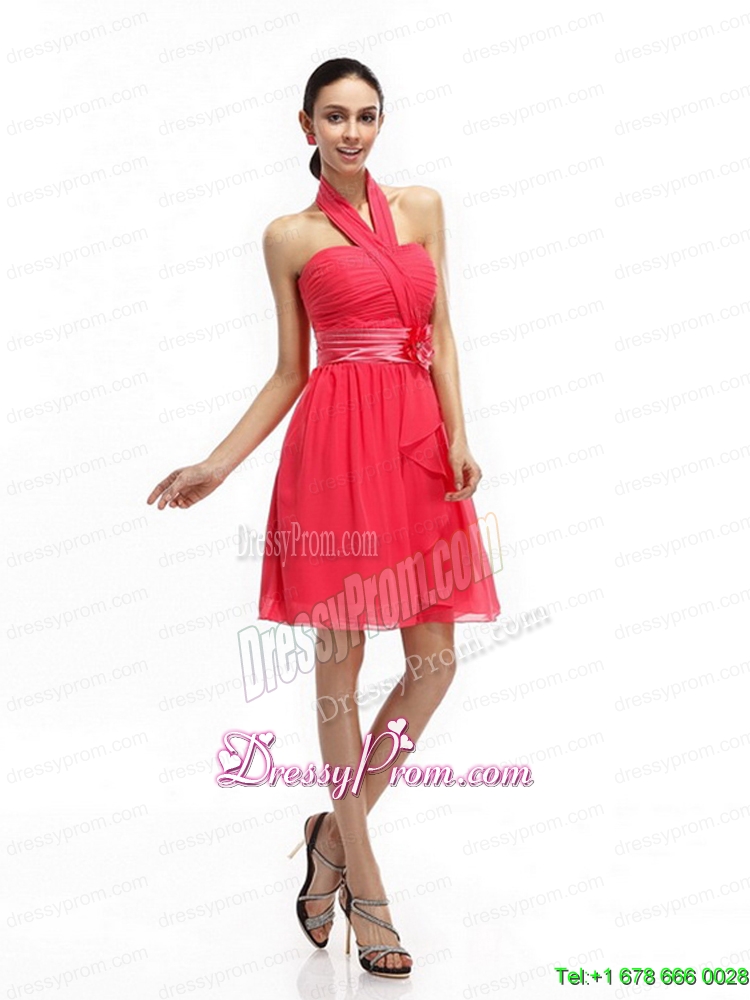 Neckline : Halter top Shown Color : Red Sleeve Length : sleeveless Hemline : mini length Back Detail : Zipper Fabric : Chiffon Embellishment : Ruching,Hand Made Flower Occasion : Prom,Cocktail,Homecoming,Graduation Season : Spring,Summer,Fall