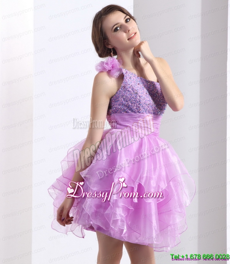 Neckline : One shoulderShown Color : LilacSleeve Length : sleevelessHemline : mini lengthBack Detail : ZipperFabric : OrganzaEmbellishment : Beading,Hand Made FlowerOccasion : Prom,Cocktail,Homecoming,GraduationSeason : Spring,Summer,Fall