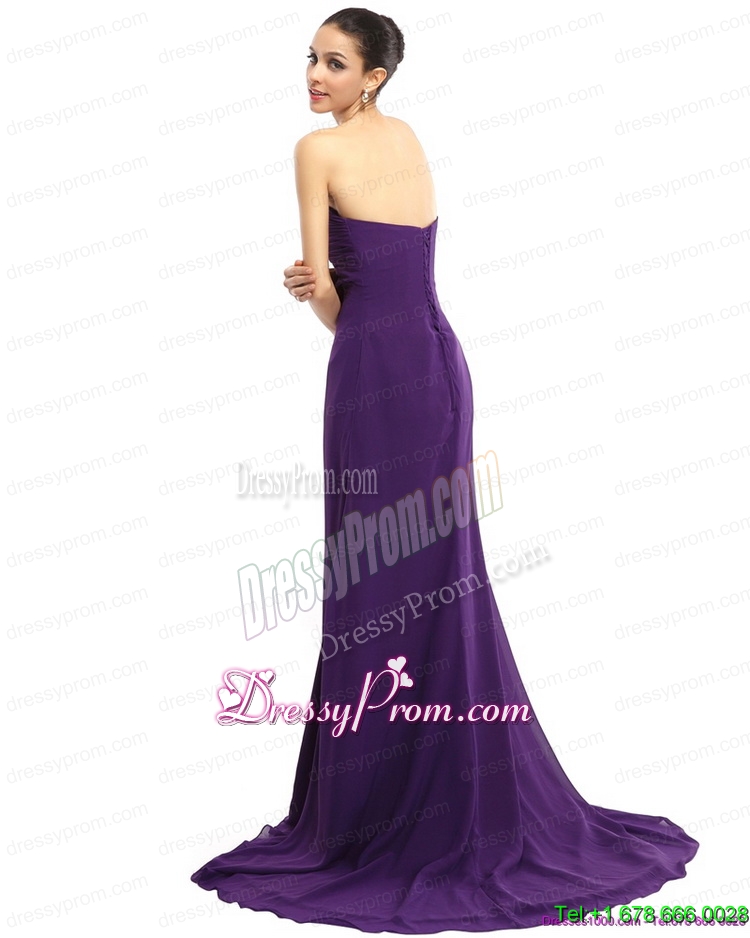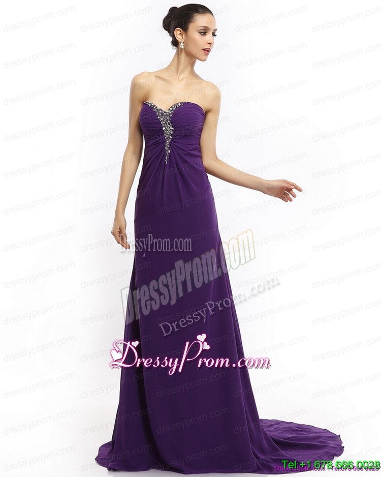 Neckline : SweetheartShown Color : Dark PurpleSilhouette : EmpireSleeve Length : sleevelessHemline : with trainBack Detail : Lace upFabric : ChiffonEmbellishment : Beading,RuchingOccasion : Prom,Party,Cocktail,Homecoming,GraduationSeason : Spring,Summer,Fall,Winter