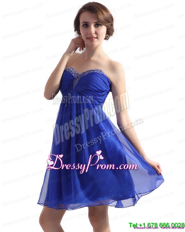 Neckline : SweetheartShown Color : BlueSilhouette : Column/SheathSleeve Length : sleevelessHemline : mini lengthBack Detail : ZipperFabric : ChiffonEmbellishment : Beading,RuchingOccasion : Prom,Cocktail,Homecoming,GraduationSeason : Spring,Summer,Fall
