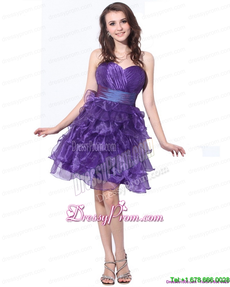Neckline : SweetheartShown Color : PurpleSilhouette : A-lineSleeve Length : sleevelessHemline : mini lengthBack Detail : ZipperFabric : OrganzaEmbellishment : Ruffled LayersOccasion : Prom,Cocktail,Homecoming,GraduationSeason : Spring,Summer,Fall