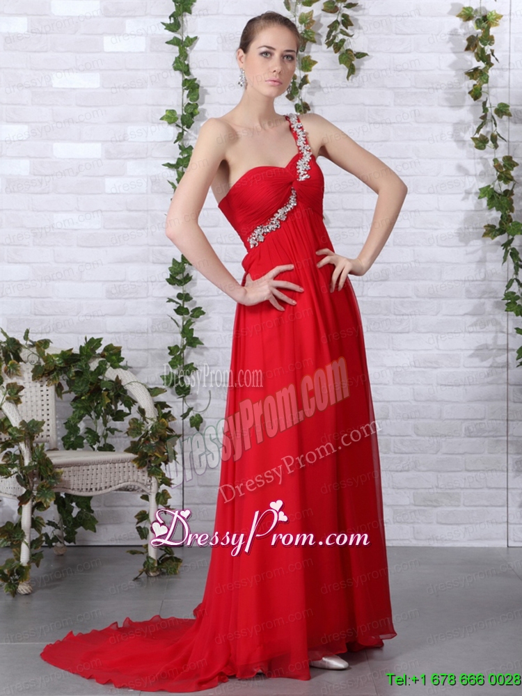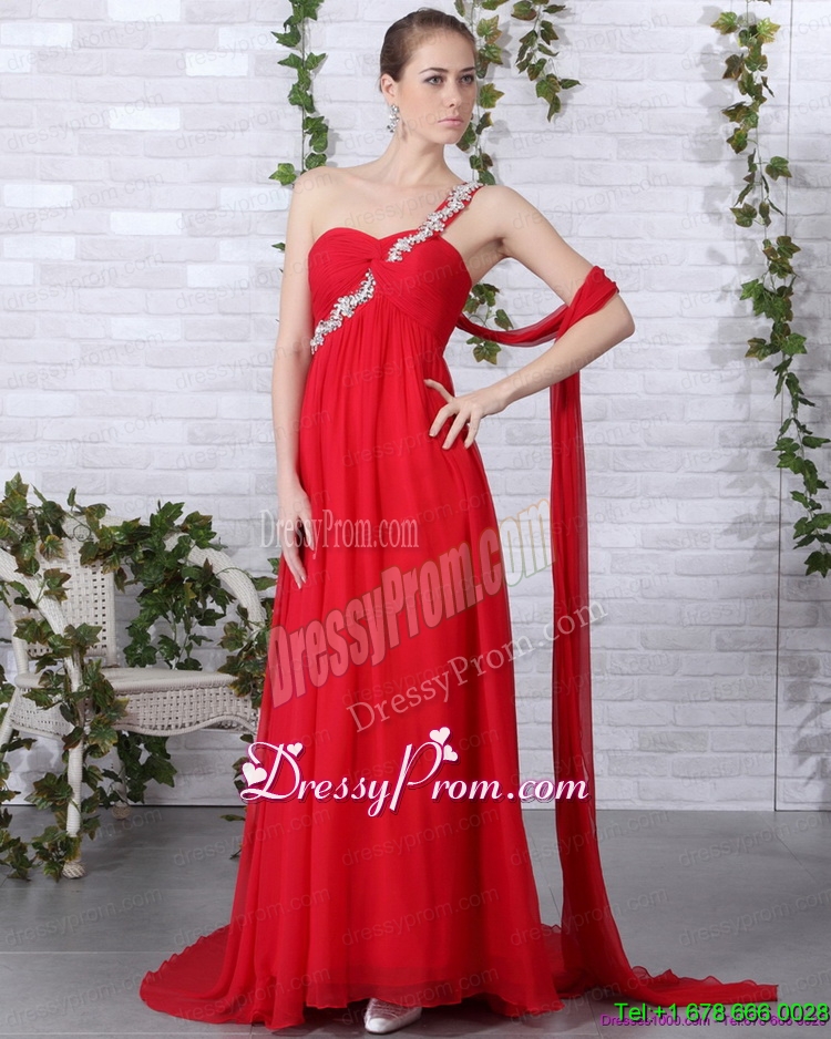 Neckline : One shoulderShown Color : RedSilhouette : EmpireSleeve Length : sleevelessHemline : with trainBack Detail : ZipperFabric : ChiffonEmbellishment : Beading,RuchingOccasion : Prom,Formal Evening,Homecoming,GraduationSeason : Spring,Summer,Fall,Winter