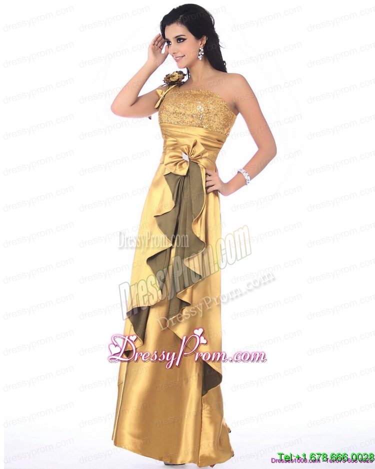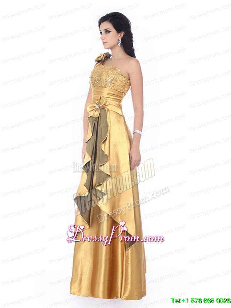 Neckline : One shoulderShown Color : GoldSilhouette : Column/SheathSleeve Length : sleevelessHemline : floor lengthBack Detail : ZipperFabric : TaffetaEmbellishment : Beading,Ruching,Hand Made FlowerOccasion : Prom,Formal Evening,Homecoming,GraduationSeason : Spring,Summer,Fall,Winter