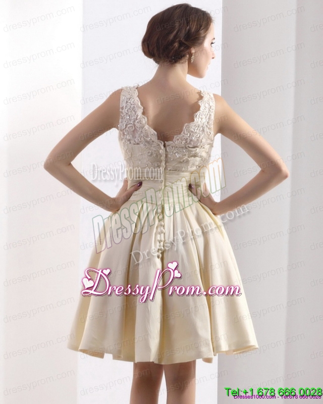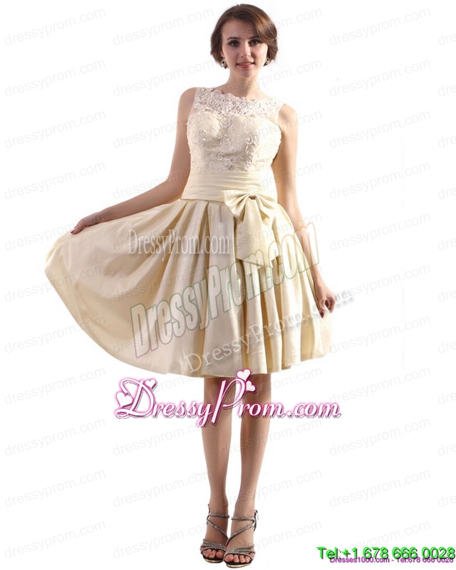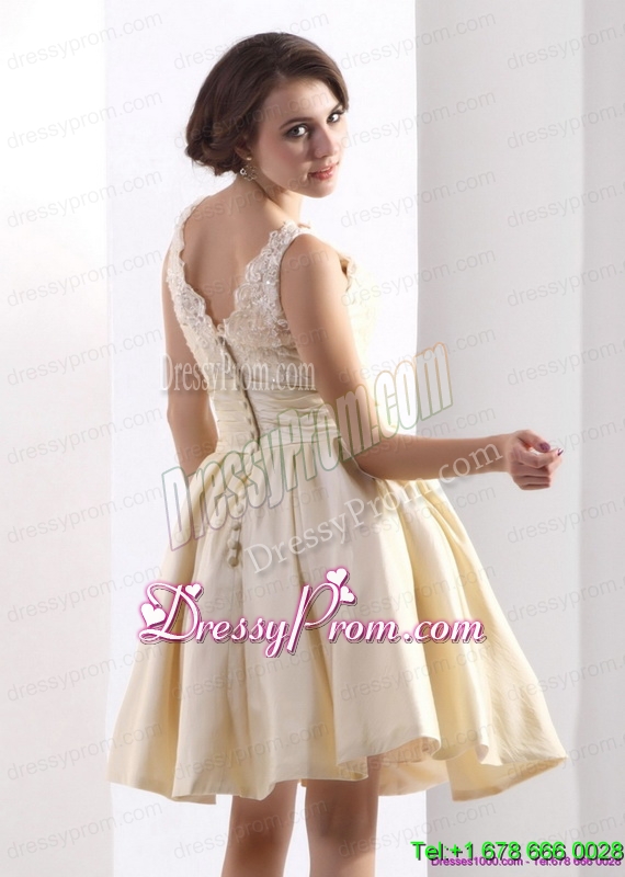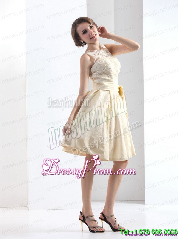 Neckline : High-neckShown Color : ChampagneSilhouette : A-lineSleeve Length : sleevelessHemline : mini lengthBack Detail : ZipperFabric : TaffetaEmbellishment : Ruching,BowknotOccasion : Prom,Party,Cocktail,Homecoming,GraduationSeason : Spring,Summer,Fall