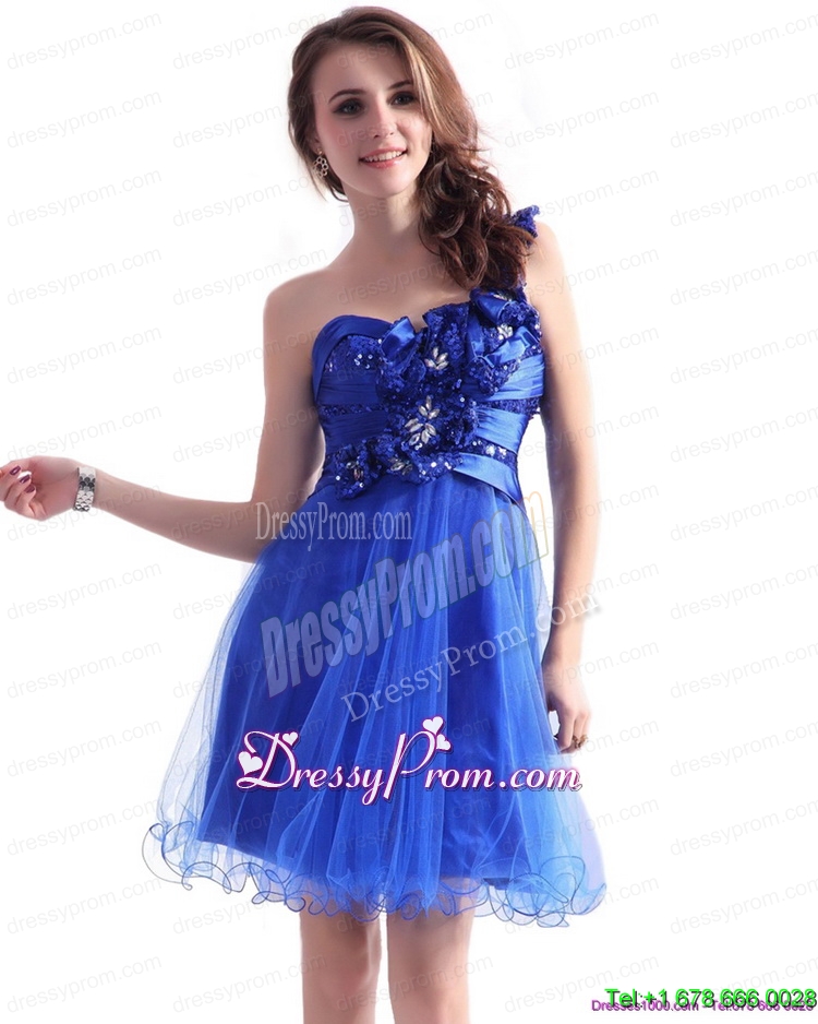 Neckline : One shoulderShown Color : BlueSilhouette : Column/SheathSleeve Length : sleevelessHemline : mini lengthBack Detail : ZipperFabric : OrganzaEmbellishment : Beading,Hand Made FlowerOccasion : Prom,Party,Cocktail,Homecoming,GraduationSeason : Spring,Summer,Fall