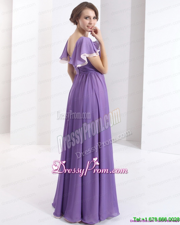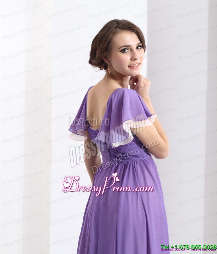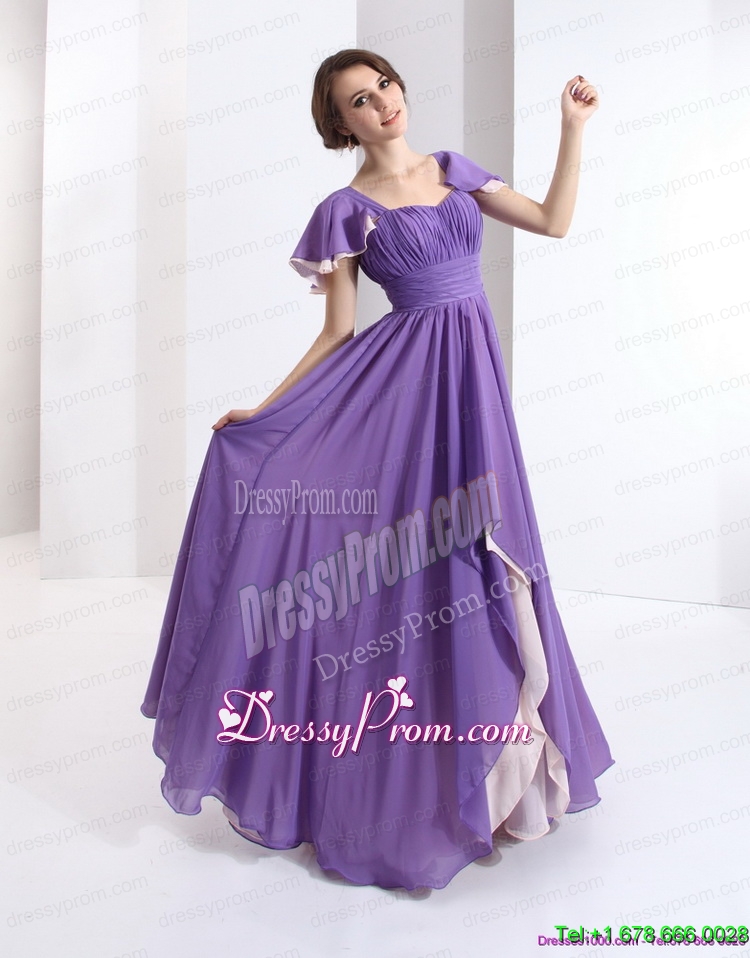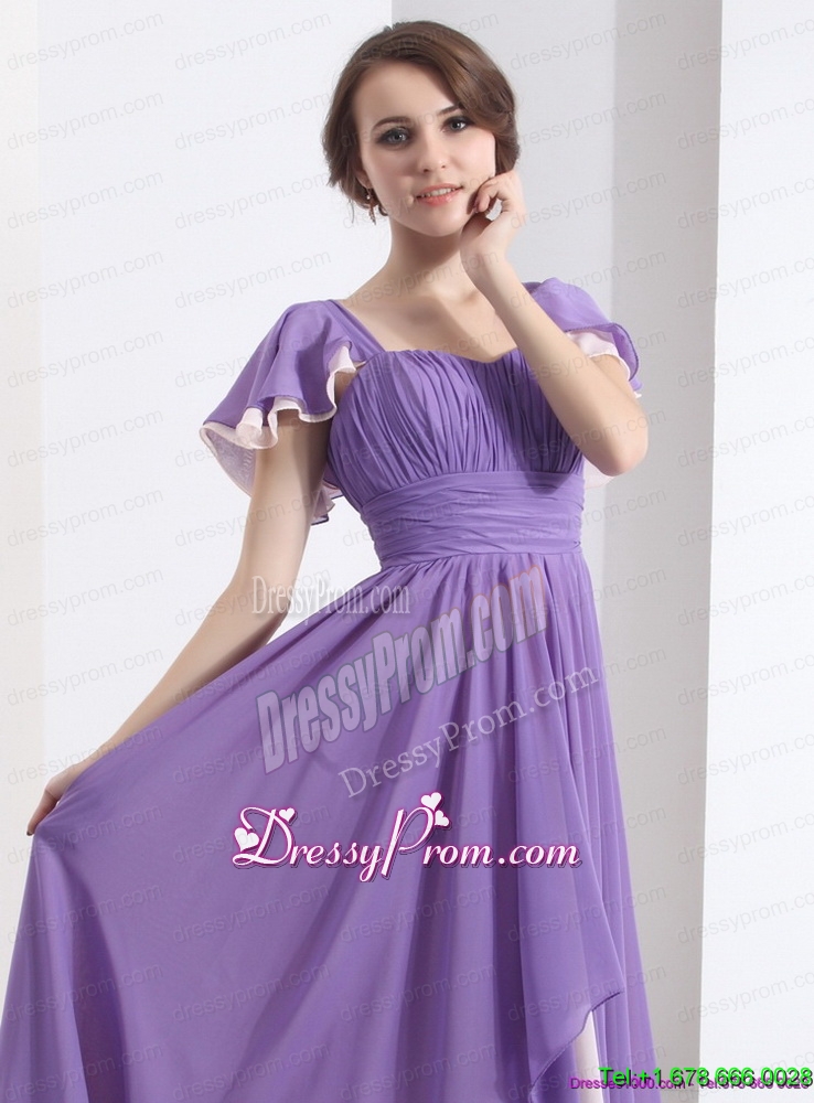 Neckline : SquareShown Color : LilacSilhouette : EmpireSleeve Length : cap sleevesHemline : floor lengthBack Detail : ZipperFabric : ChiffonEmbellishment : RuchingOccasion : Prom,Formal Evening,Homecoming,GraduationSeason : Spring,Summer,Fall,Winter