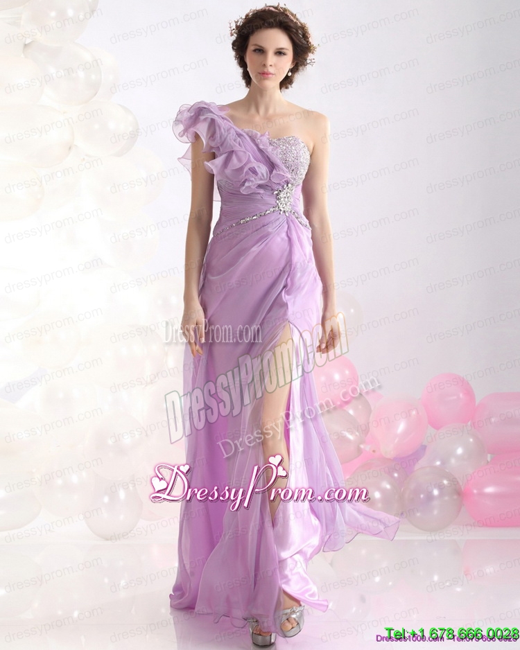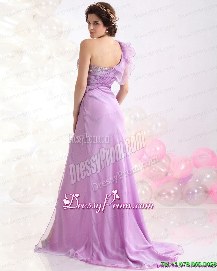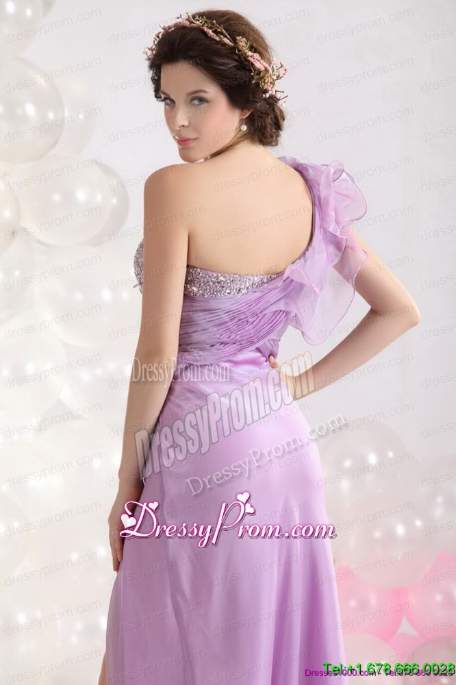 Neckline : One shoulderShown Color : LilacSilhouette : EmpireSleeve Length : sleevelessHemline : floor lengthBack Detail : Side zipperFabric : ChiffonEmbellishment : BeadingOccasion : Prom,Formal Evening,Homecoming,GraduationSeason : Spring,Summer,Fall,Winter