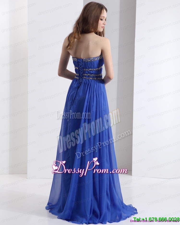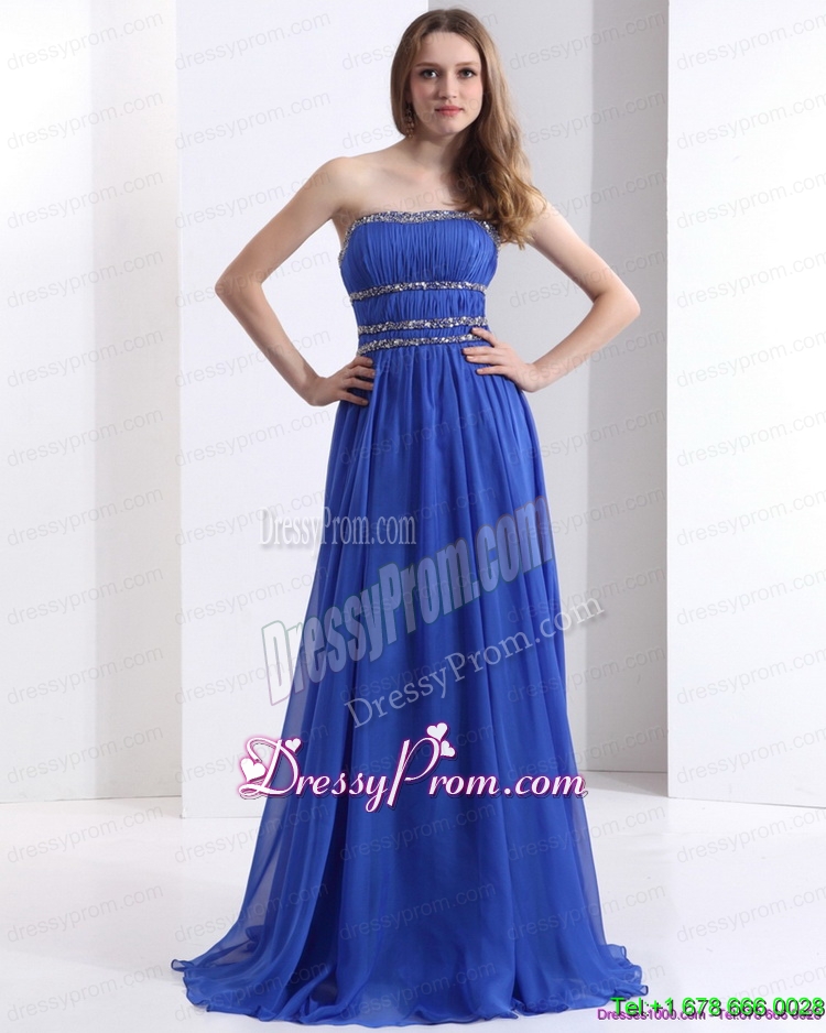 Neckline : StraplessShown Color : BlueSilhouette : EmpireSleeve Length : sleevelessHemline : with trainBack Detail : Lace upFabric : ChiffonEmbellishment : Beading,RuchingOccasion : Prom,Party,Cocktail,Homecoming,GraduationSeason : Spring,Summer,Fall,Winter