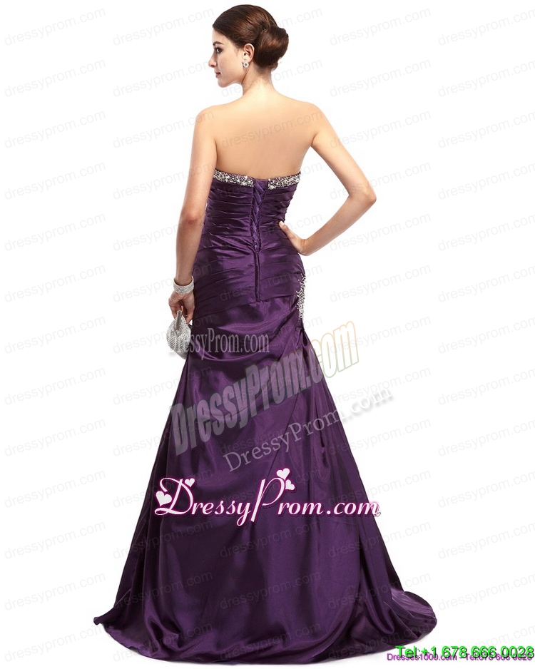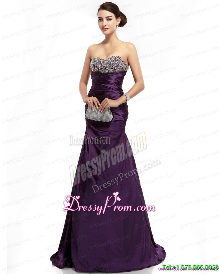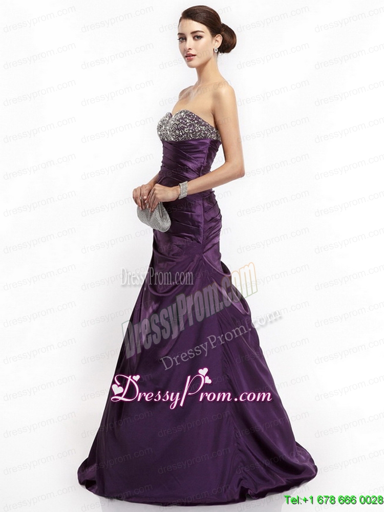 Neckline : SweetheartShown Color : Dark PurpleSilhouette : Column/SheathSleeve Length : sleevelessHemline : with trainBack Detail : Lace upFabric : TaffetaEmbellishment : Beading,RuchingOccasion : Prom,Party,Cocktail,Homecoming,GraduationSeason : Spring,Summer,Fall,Winter